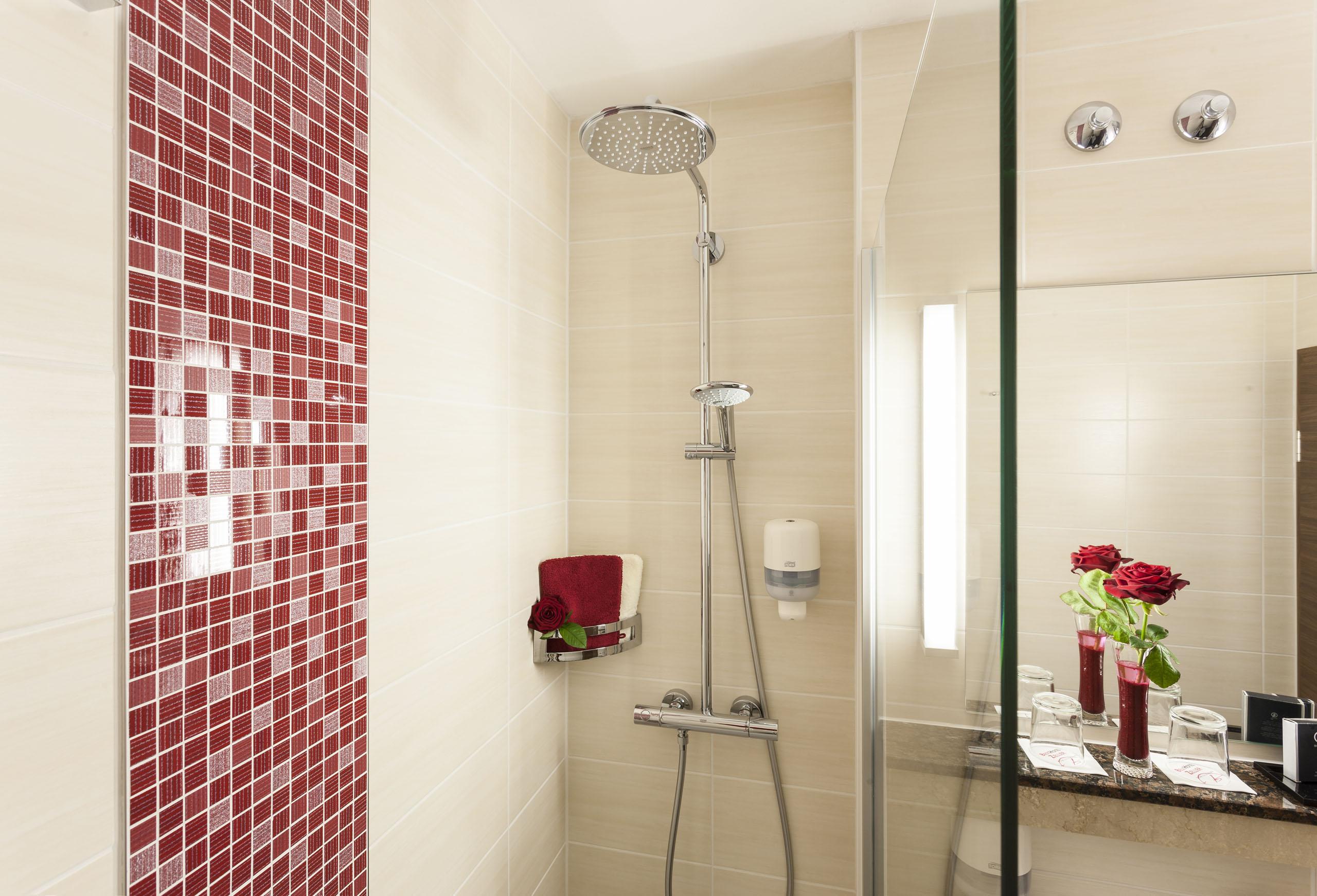 - Modernes Badezimmer mit Badewanne oder begehbarer Brause- und Regen-Dusche, Kosmetikspiegel, Föhn, WC und diversen Accessoires